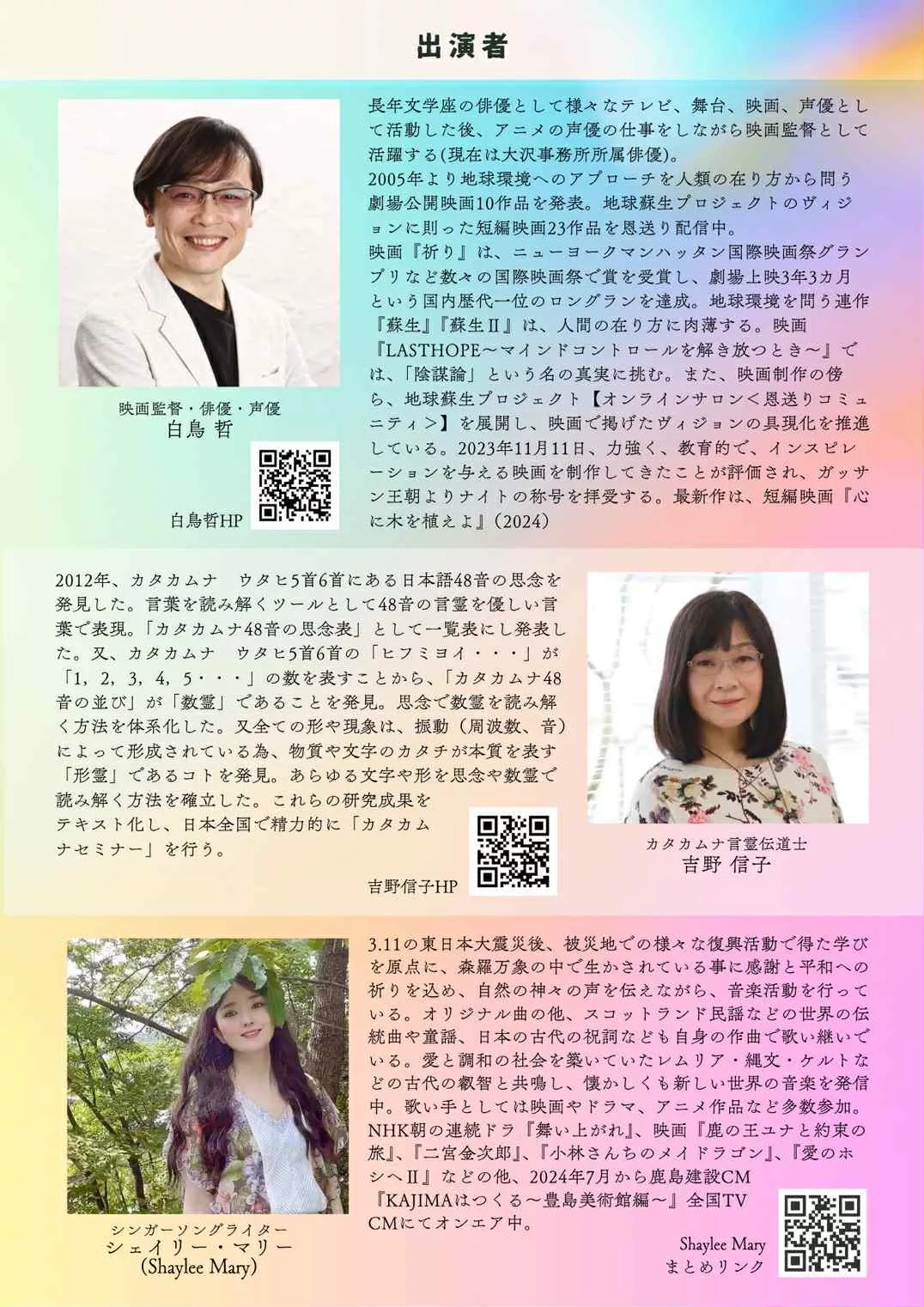 これまで地球への思いや意識、目指す方向性が同じで、それぞれの立場で活動を続けてきた、地球蘇生プロジェクトを運営する白鳥哲監督、カタカムナを通して調和の精神性を伝えてきた吉野信子、地球を守る龍や自然の神々の声を伝え、共に歌を歌うシンガーソングライターのシェイリー・マリー。